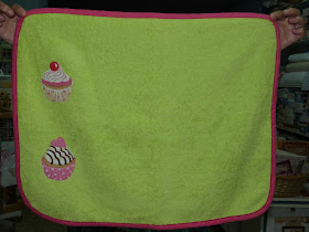 Estos dos paños de cocina, con cupcakes aplicadas, uno en verde y otro en rosa, con el bies al contrario.